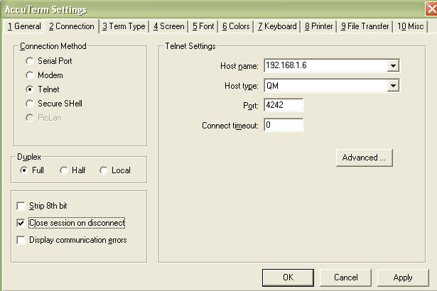 If you'd like AccuTerm to close once the session is disconnected, click on the check box that indicates: Close session on disconnect.